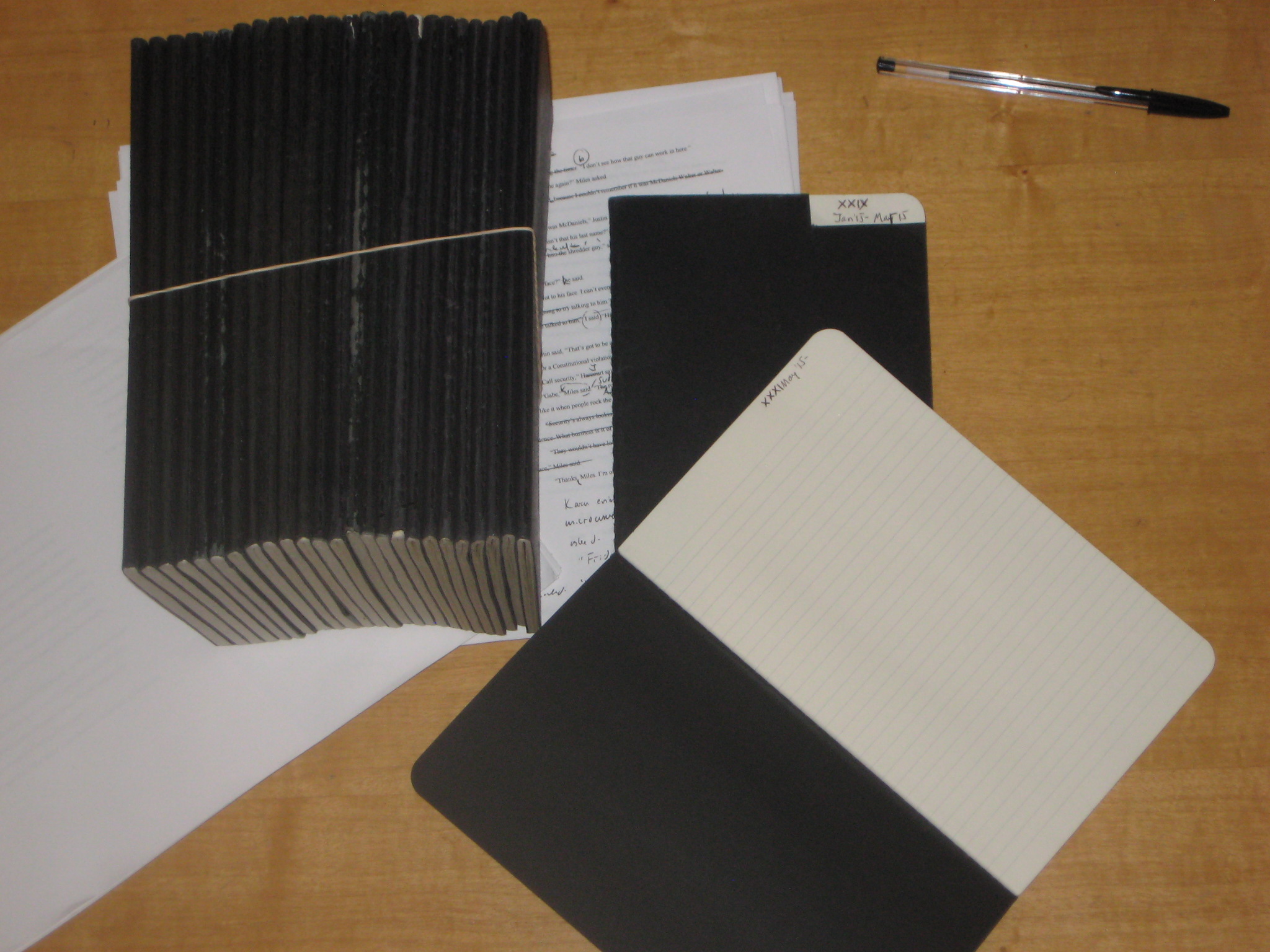 First thing I did upon sitting at my desk was flip open the back of the journal and jot the hour and minute. When I finished, I wrote again the hour and minute. Some days I was lucky enough to do this only once for a long period. On Thursday of week XXXIV, for example, I wrote from 1:35 a.m. until 3:13. An hour 38 in one sitting!