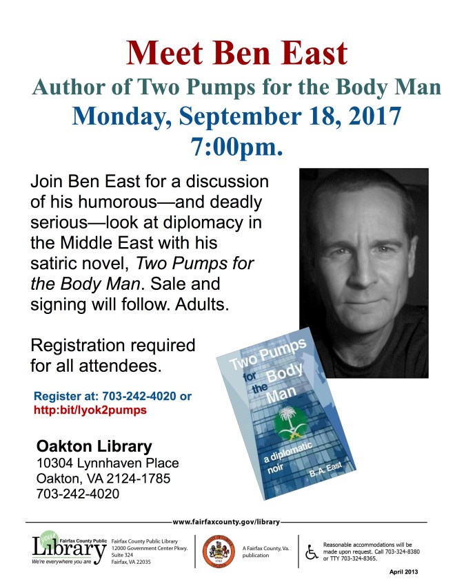 In an effort to prove why writing is easy and speaking is hard, I decided to do live stand-up at the library in Oakton, VA. Drop by to find out why I write instead of preach, and what’s behind that title—Two Pumps for the Body Man.