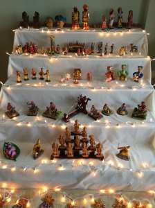 Our display consists of five steps populated by dolls. Some represent the gods and goddesses who lent their power to Goddess Durga in her nine-night battle against the buffalo demon Mahishasura. Others are drawn from every day life, including palace life and the work of common artisans.