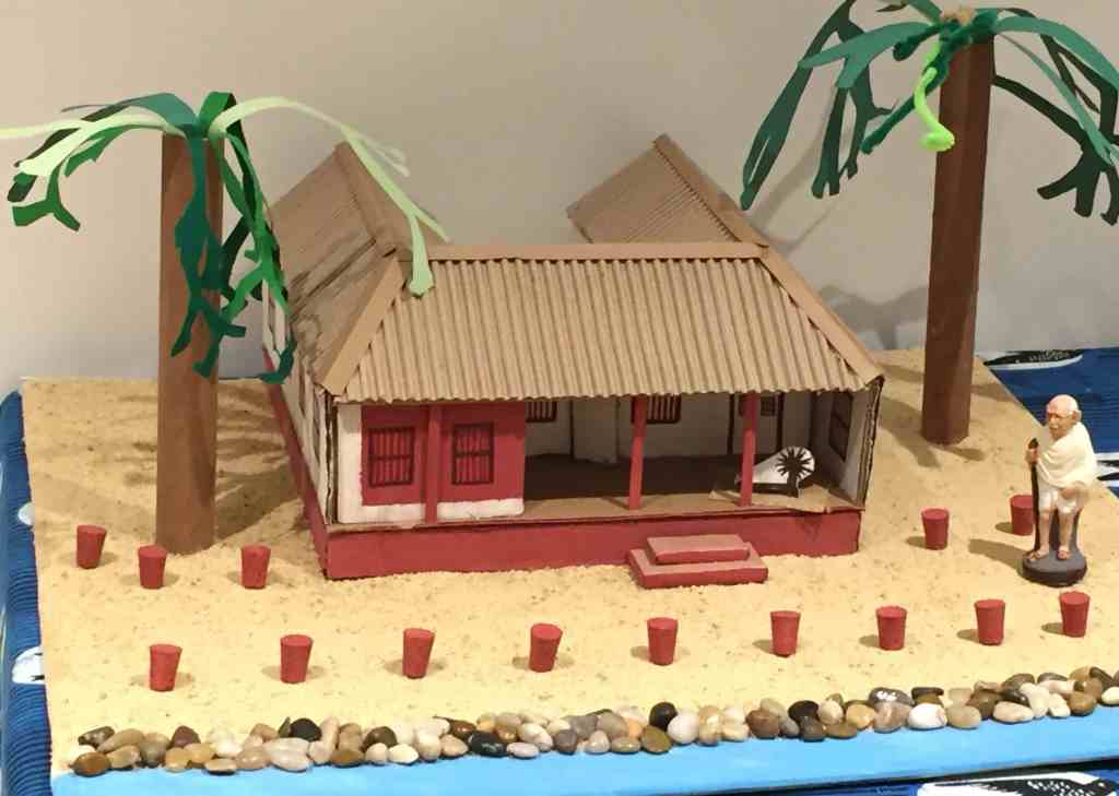 It’s nearly finished, this replica of his simple home on the banks of the Sabarmati River in Gujarat. We’ll embellish the red pots with rosemary to give the appearance of living bushes set upon the sand from which our home-made trees spring up.