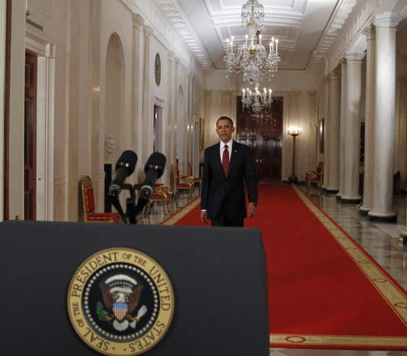 It’s the carpet behind him that I recall, blood red and trimmed in gold. Stark, contrasting against the light marble floor, it lent gravitas to the Commander in Chief stalking the podium with the presidential seal.