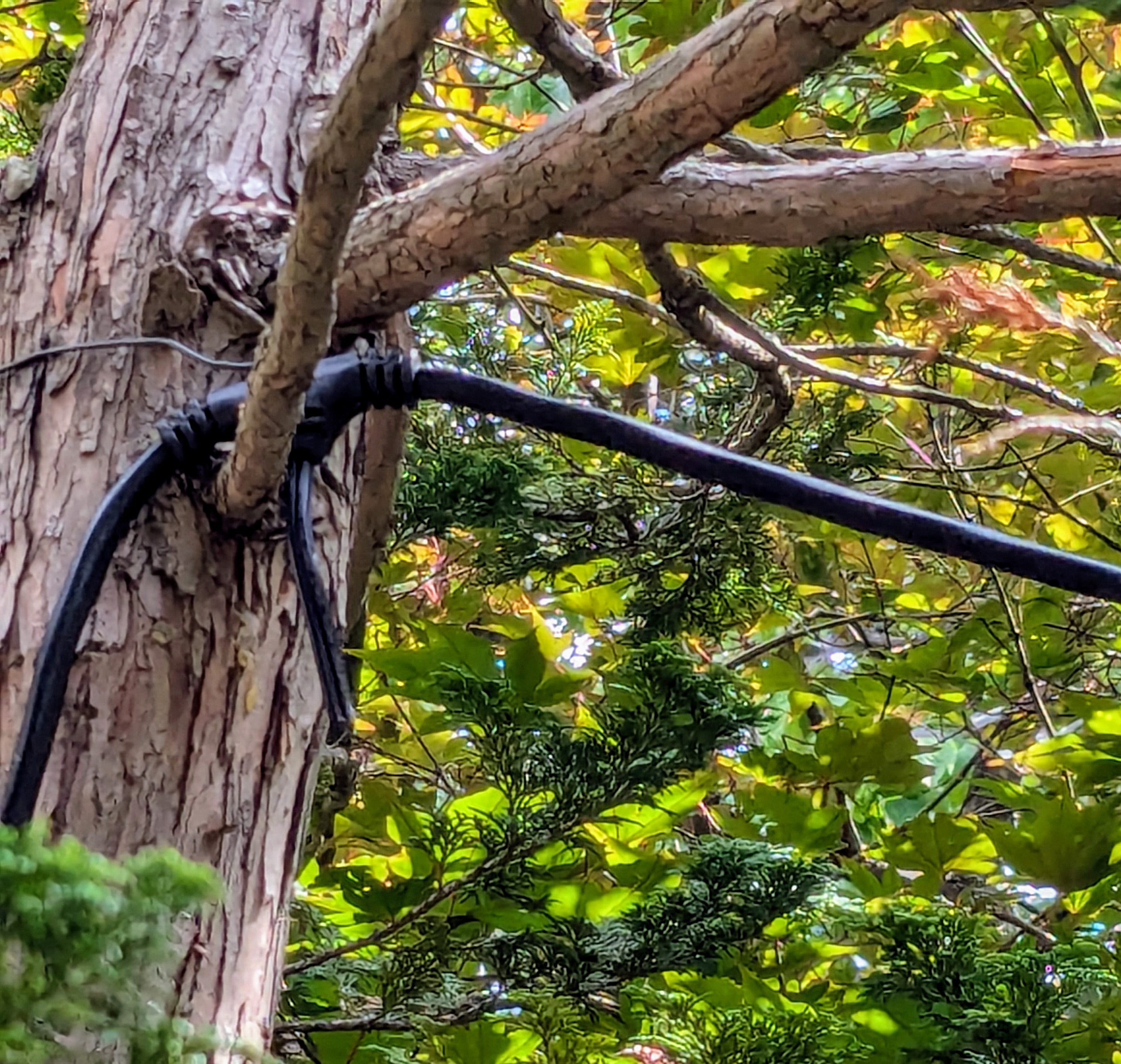 I came down the steps and looked up at the pine where it supports the lights. I saw that Future Pelt had been sharpening his teeth on something tasty in the cancer-causing oils of the plastic and rubber that a company called FEIT uses to manufacture my summer-time luminescence.