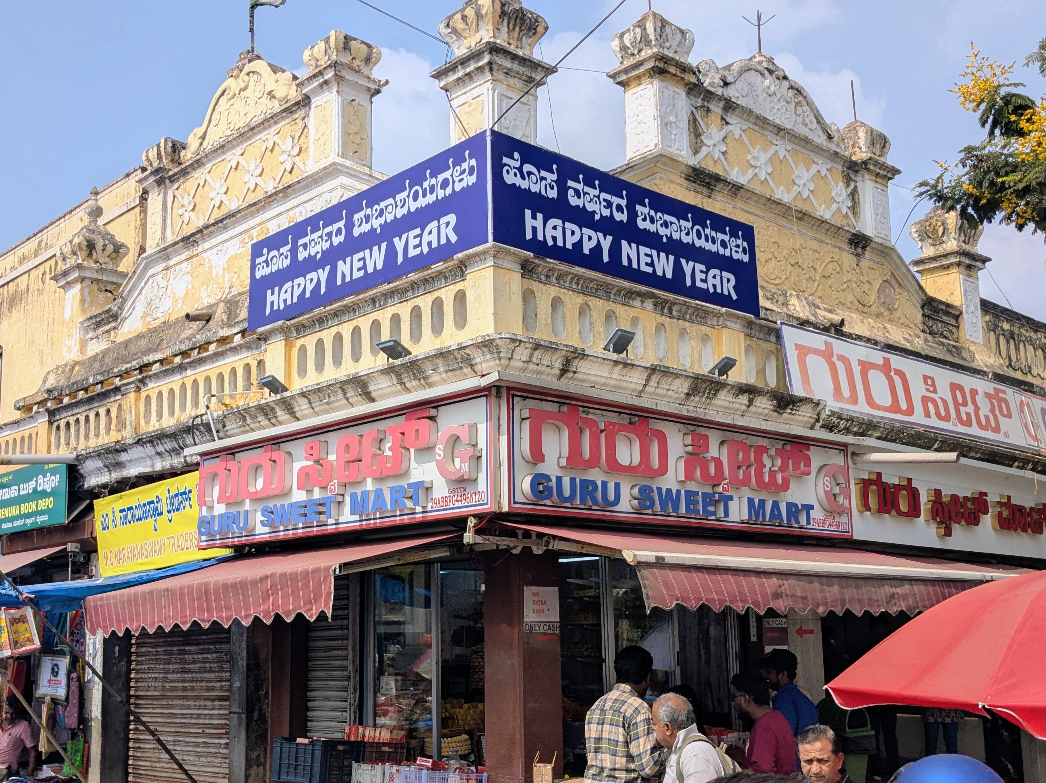 I spotted a corner that pleased me very much, serendipity on New Year’s Eve, a simple message above a corner sweet shop on Mysore’s Sayyaji Rao Road. Guru’s Sweet Mart, just off K.R. Circle—which, it should be noted, has no corners.