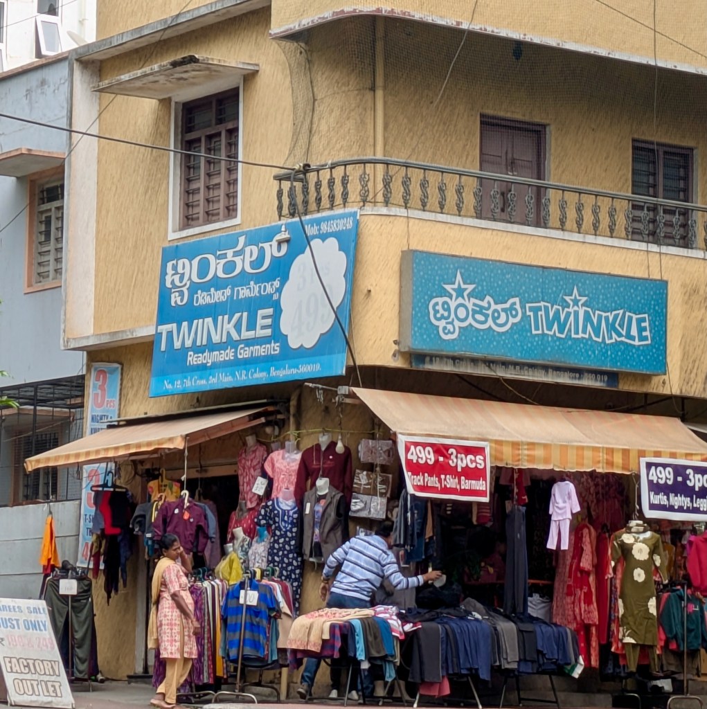 Twinkle, the corner garment store in Bangalore. Not be be confused with Mumbai’s Gentleman’s Hair Salon, also called Twinkle.